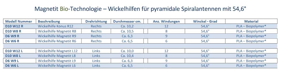 Wir haben insgesamt 8 verschiedene Modelle mit unterschiedlicher Anzahl der Umdrehungen sowie links (nach oben) als auch rechtsdrehend (nach unten). So können viele Bedürfnisse der Energie- und ElektroKultur abgedeckt werden. In Kombination mit dem Magnetit-Reaktor wird der Effekt um das Vielfache verstärkt.